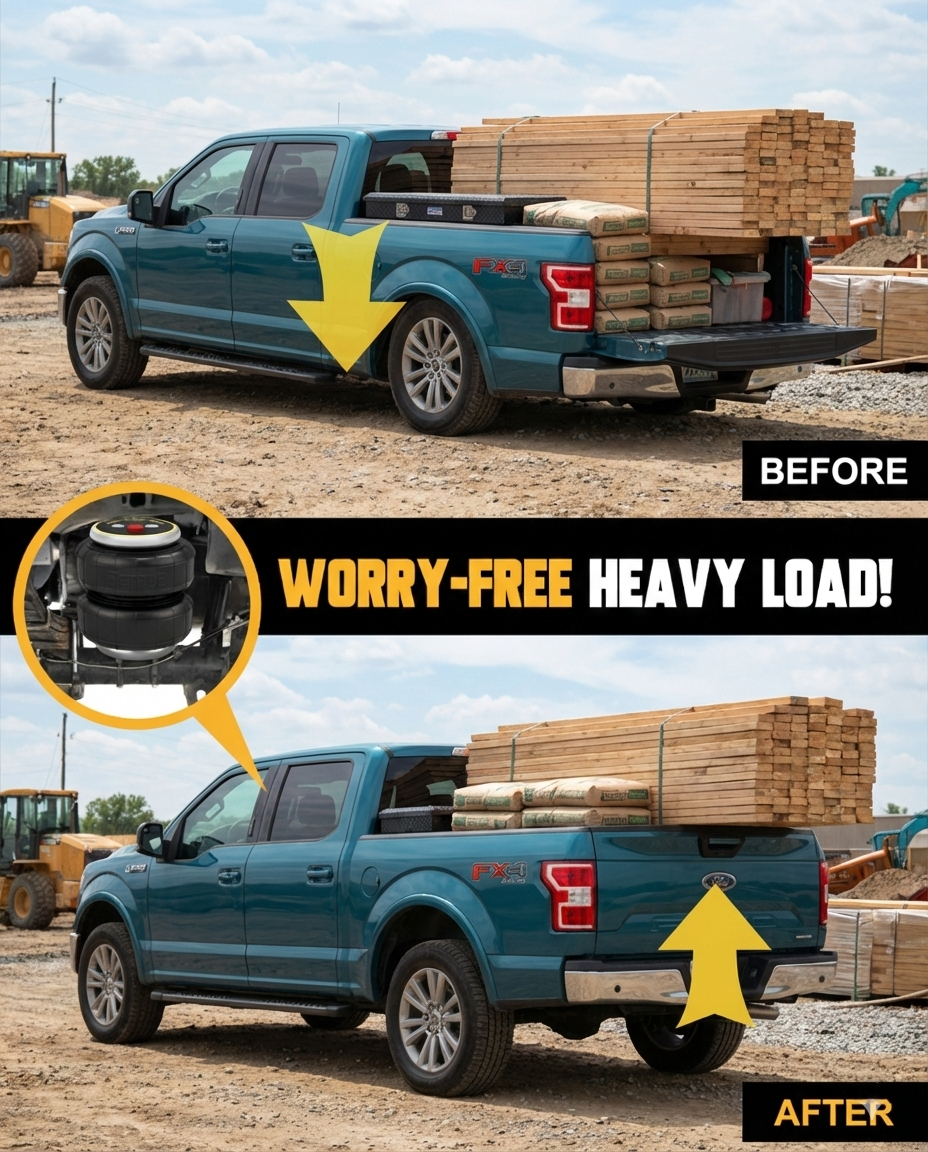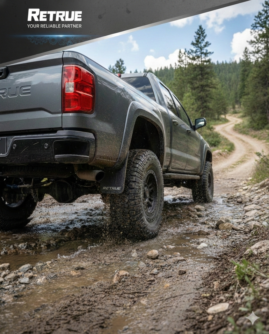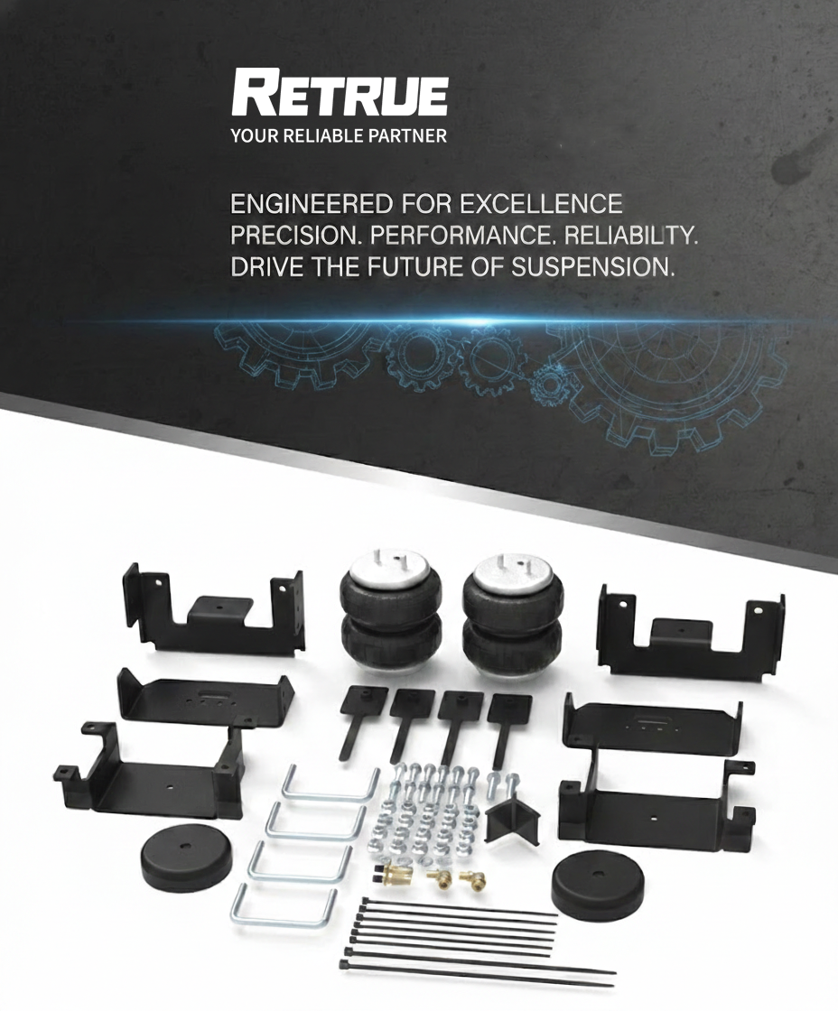 "Truck squat" occurs when the rear suspension is overloaded. RETRUE air springs provide up to 5,000 lbs of load-leveling capacity. By adjusting the air pressure, you can level your truck back to its factory height, eliminating sag and preventing the "nose-up" position that compromises front-tire traction.