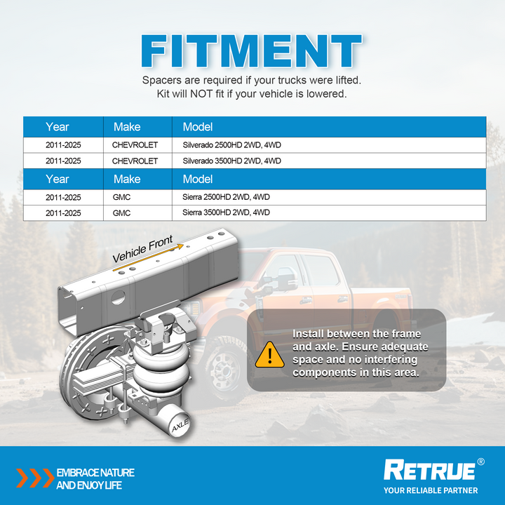 AJUSTEMENT PARFAIT ET REMPLACEMENT FIRESTONE RIDE-RITE : Compatible avec Chevrolet Silverado 2500HD/3500HD et GMC Sierra 2500HD/3500HD (2WD/4WD) 2011-2025, ce kit de ressorts d'assistance pneumatique est un remplacement direct des ressorts Firestone Ride-Rite 2613 et 2709, offrant une alternative économique avec une qualité supérieure.