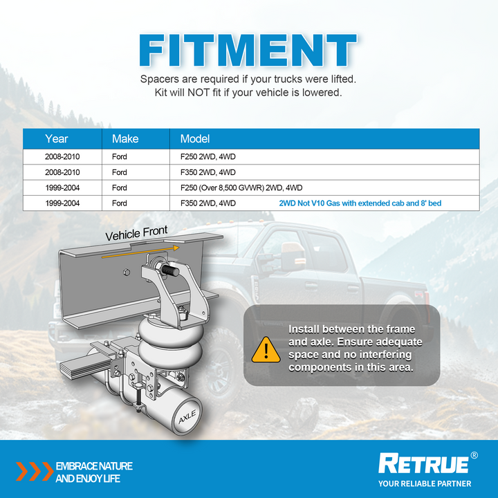 • Ce kit de suspension pneumatique est compatible avec les véhicules suivants : Ford F250 1999-2004 (plus de 8 500 GVWR) et F350 (2WD pas V10 essence avec cabine allongée et lit de 8') 2WD 4WD, pour Ford F250 2008-2010 et Ford 350 2WD 4WD.