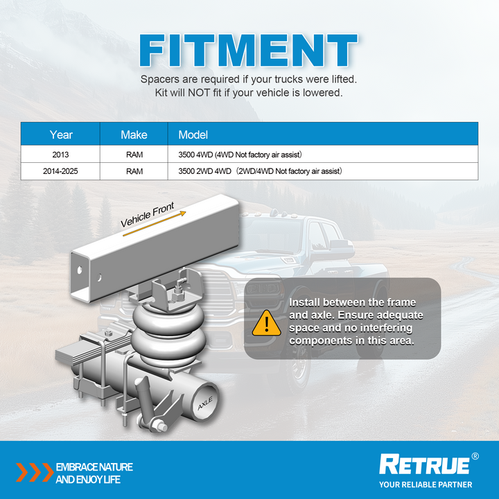 - Compatibilité véhicule - Kit de suspension arrière à airbags RETRUE pour RAM 3500 2WD 4WD 2014-2025, RAM 3500 4WD 2013, remplacement parfait pour le kit Firestone Ride-Rite 2615 et 2616