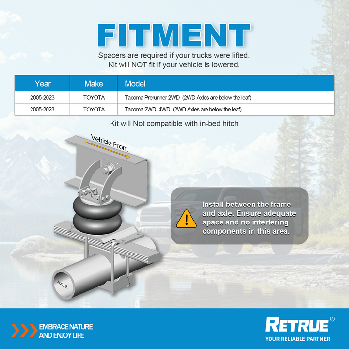 • Ce kit de suspension pneumatique est compatible avec : TOYOTA Tacoma Prerunner 2WD 2005-2023 et Tacoma 2WD/4WD 2005-2023 (les essieux 2WD sont sous la lame)