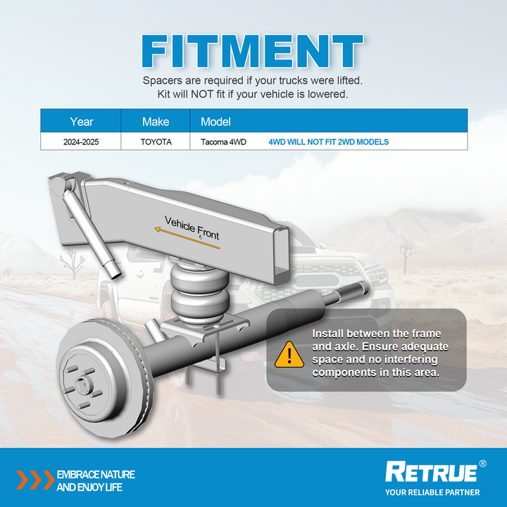- Compatibilité du véhicule : Kit de suspension arrière à airbags RETRUE adapté pour TOYOTA Tacoma 4WD 2024-2025 (4WD Ne convient pas aux modèles 2WD) Remplacement parfait pour le kit Firestone Ride-Rite 2599