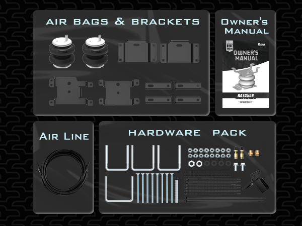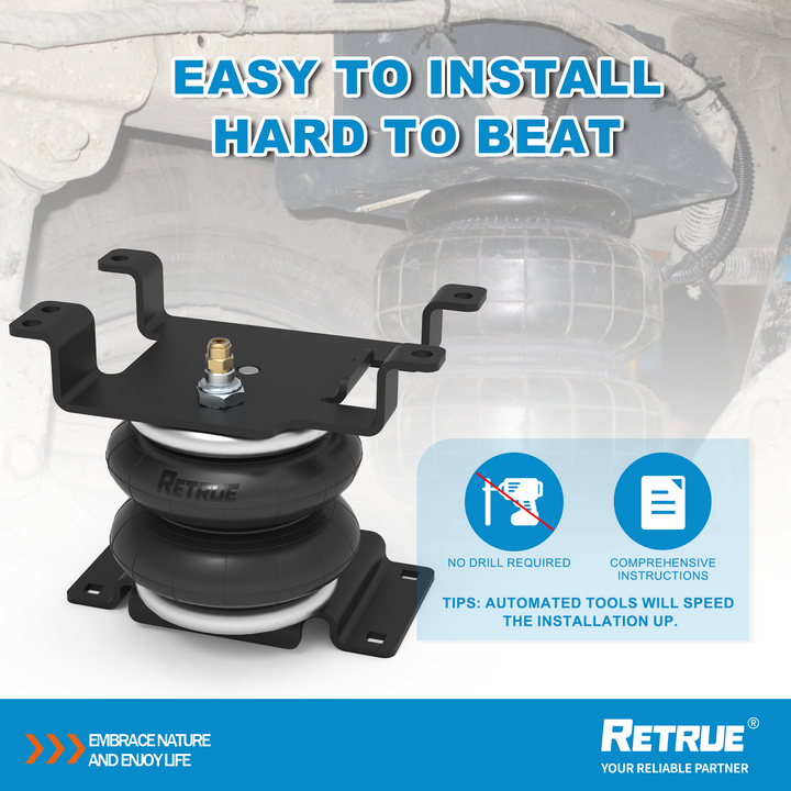 Featuring pre-drilled, bolt-on brackets for a true no-drill installation, the RETRUE rear air bag kit includes clearly labeled components and step-by-step instructions for a fast, frustration-free setup. (Tip: using powered tools can speed up the process.)