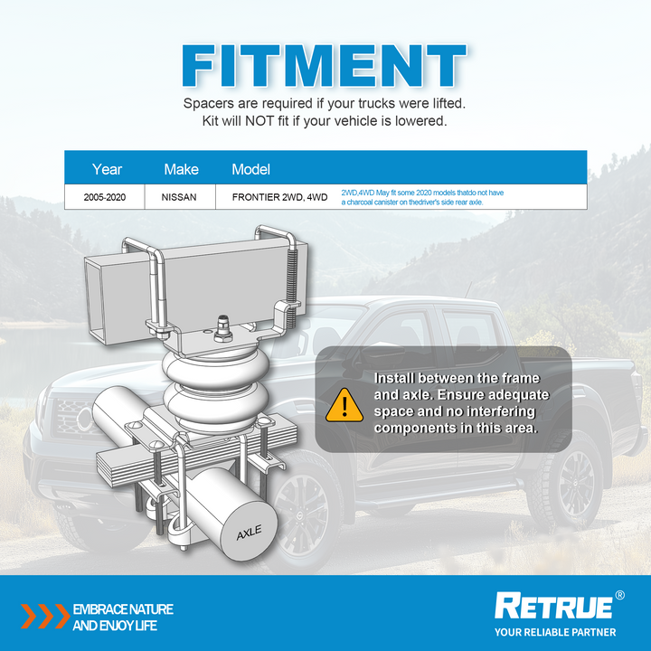 Upgrade your Nissan Frontier (2005–2020, 2WD & 4WD) with the RETRUE Rear Air Suspension Kit, engineered as a high-quality replacement for the Firestone Ride-Rite 2609 kit. Designed for enhanced load support and ride stability, this kit fits most Frontier models, with the exception of certain 2020 trims equipped with a charcoal canister on the driver-side rear axle.