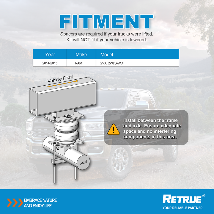 Upgrade your RAM 1500 with the RETRUE Air Suspension Kit, a reliable rear air bag helper spring system designed to improve ride quality and towing stability.